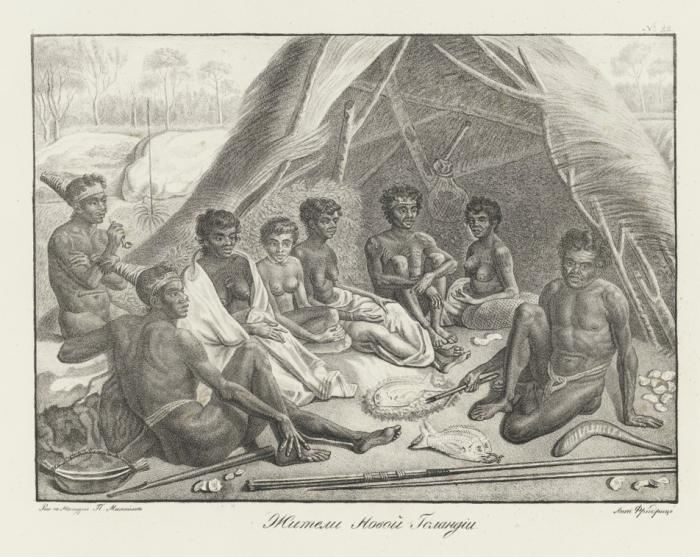 Well, his sable majesty (Bungaree) had two queens — one, I think, called Gooseberry, and the other Sugarbag. They were of inestimable use to their dusky lord, in giving him full leisure to ponder on approaching changes. This was abundantly manifested when the royal party went on a fishing excursion — for his majesty had a boat given to him, and he might have been seen on many occasions lounging smoking in his vessel while his two wives pulled the oars and caught the fish. He always said he 'lubbed' that one best that caught most 'fis.' Nor should his 'make-up' be for-gotten. It consisted of an old cocked hat and coat that were once the property of an admiral; and as the weather was generally mild, these constituted the whole of his toilet.